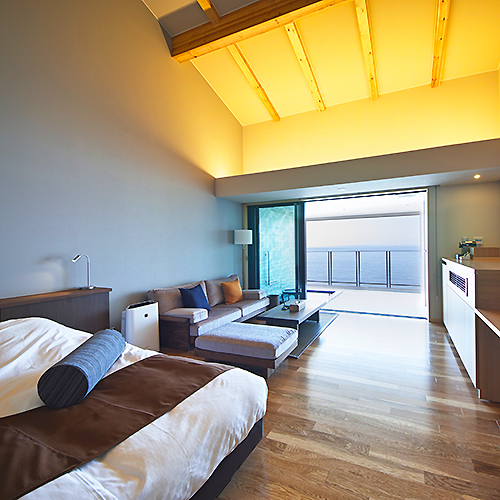 写真:広い部屋に続く海が見える露天風呂